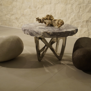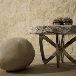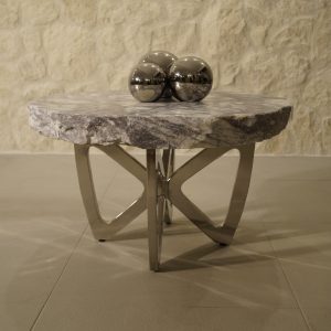The table top is made of thick marble in the shape of a circle, combined with chrome legs.